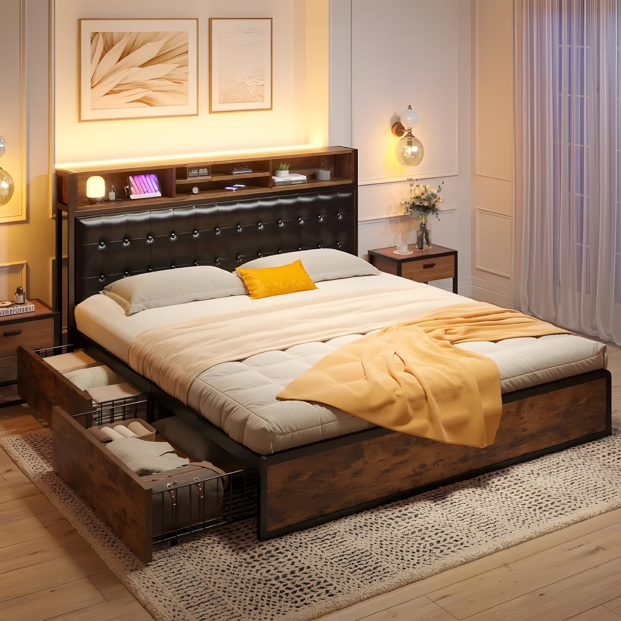The headboard is designed with additional functionality, offering built-in storage space and a convenient charging station. The charging station includes USB ports and outlets, making it easy to charge your devices right next to your bed. This feature makes it perfect for modern living, allowing you to keep your phone, tablet, or laptop within reach while keeping the bedroom organized.