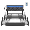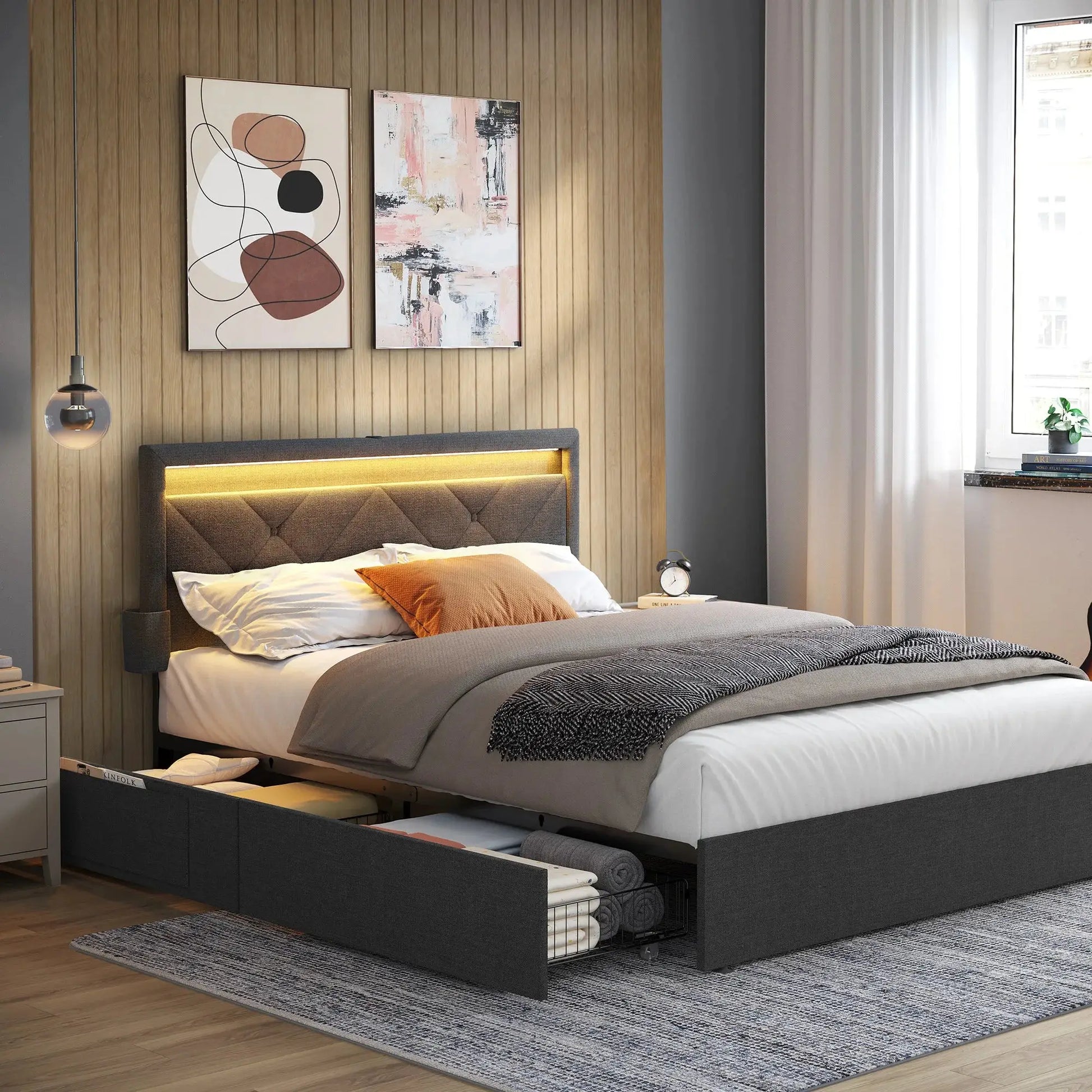 One of the standout features of this bed frame is its built-in storage drawers. Equipped with four spacious drawers, it allows you to maximize your bedroom space by providing ample storage for clothes, linens, or personal items. These drawers are designed to blend seamlessly into the bed's structure, ensuring a clutter-free space. Perfect for those living in smaller spaces or anyone looking to keep their room tidy, these drawers offer a clever solution for storage.