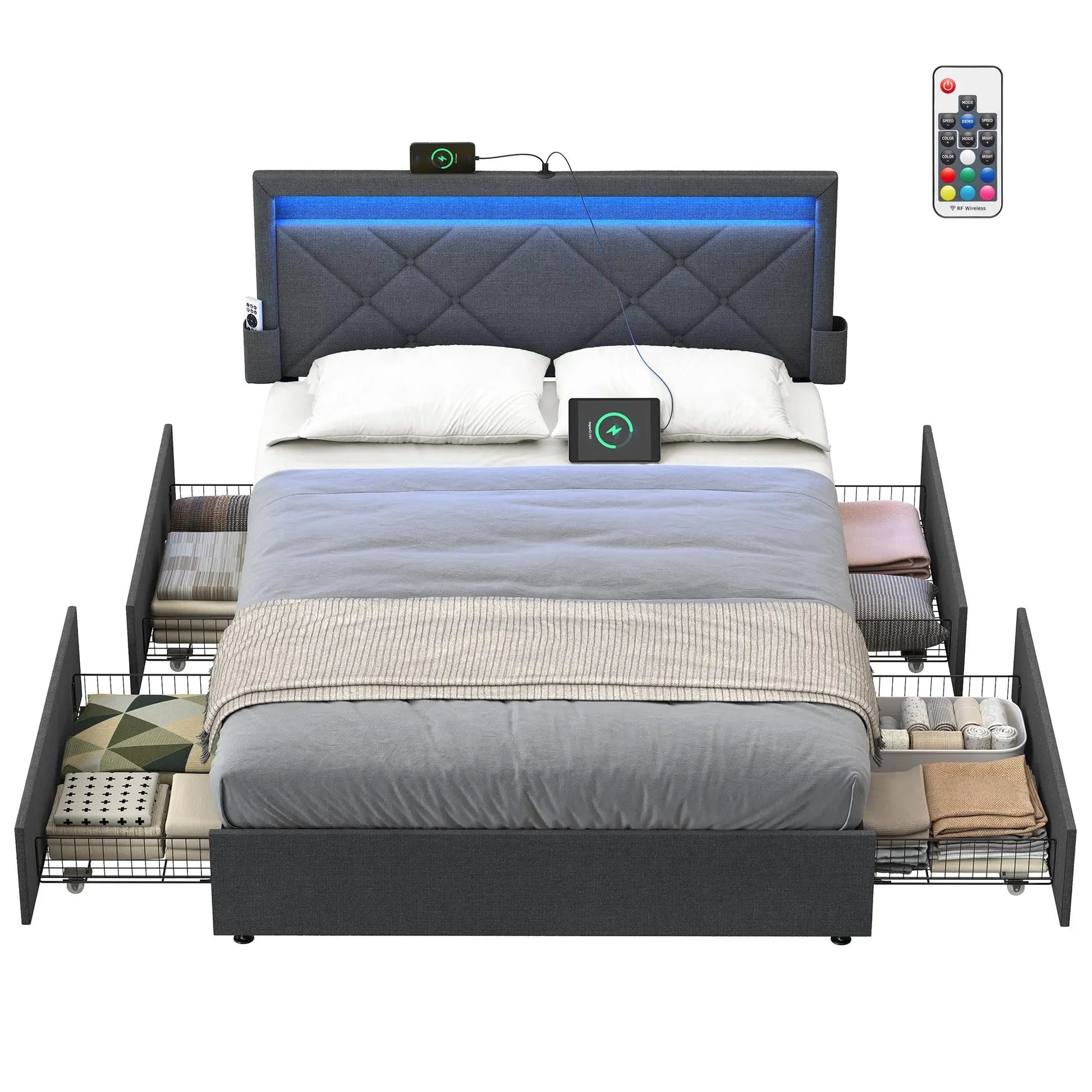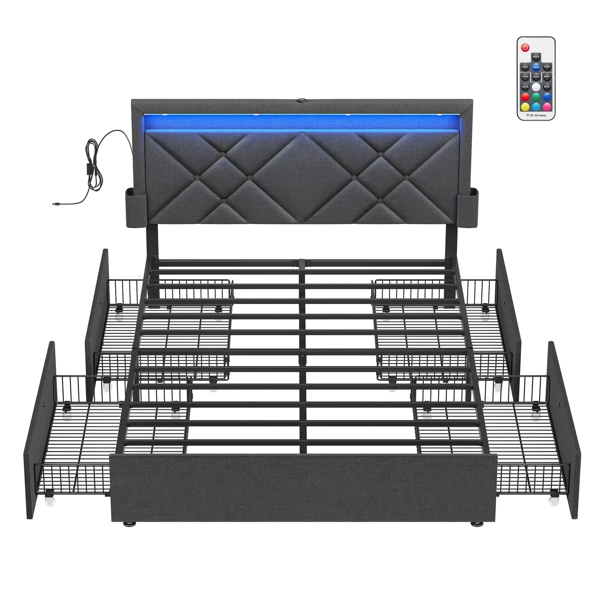 This Double Bed frame is the perfect blend of style, functionality, and practicality. Designed to meet your needs, this bed features storage drawers, LED lighting, and a multi-socket outlet. It’s a versatile piece that not only provides a comfortable sleeping space but also helps organize your bedroom with ease. The sleek metal frame offers durability while maintaining a modern and minimalist aesthetic. Whether you're furnishing a small apartment or simply need extra storage, this bed is the perfect addition to your home.