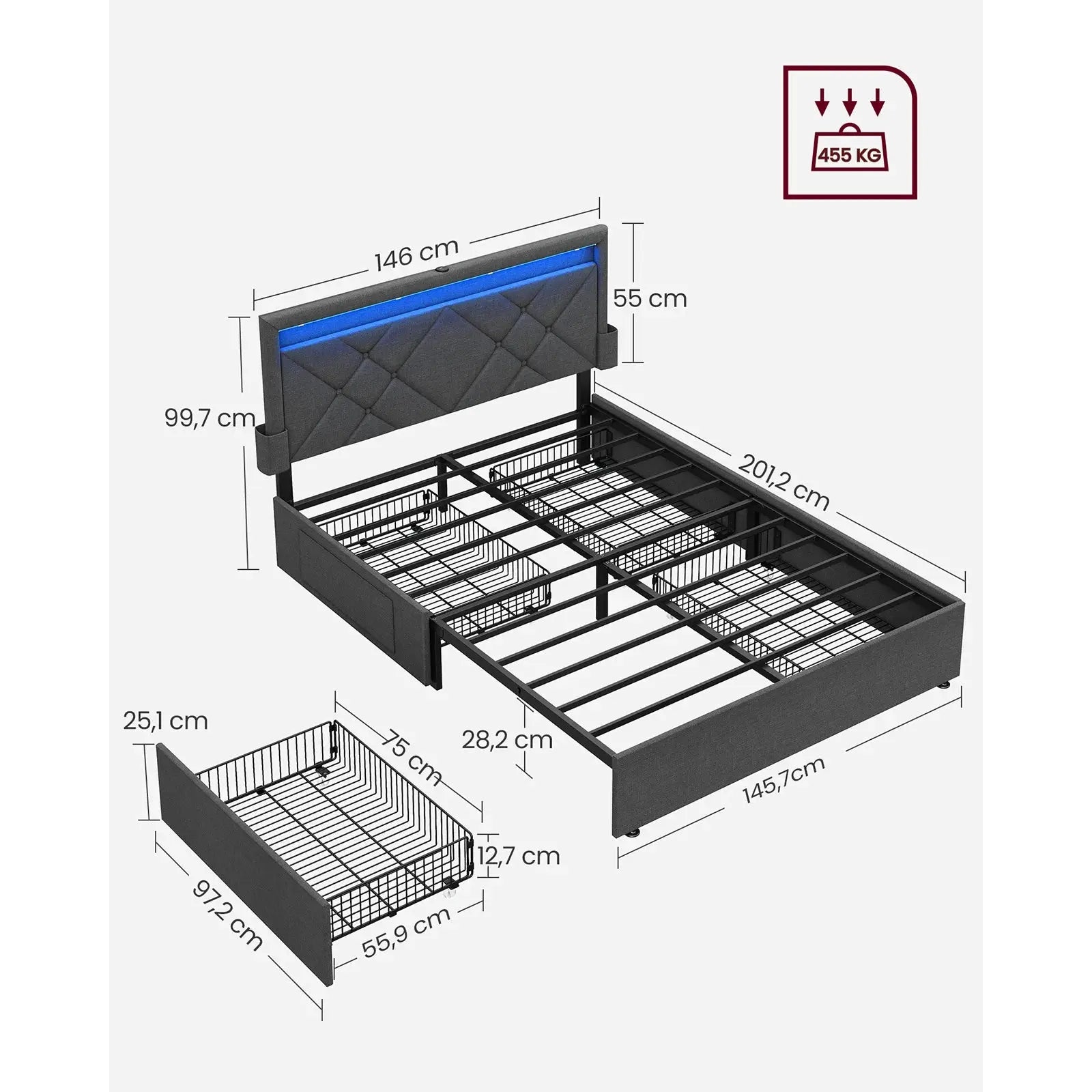 This bed frame is not just practical—it also adds a touch of ambiance to your room with its integrated LED lighting. The LED lights can create a relaxing atmosphere, making your bedroom a cozy and inviting space. Whether you want soft lighting to unwind before sleep or a subtle nightlight, the LED feature on this bed adds a modern and stylish flair to your bedroom. This feature is particularly convenient as it doesn’t require additional lamps, offering a sleek and integrated lighting solution.